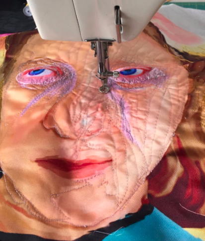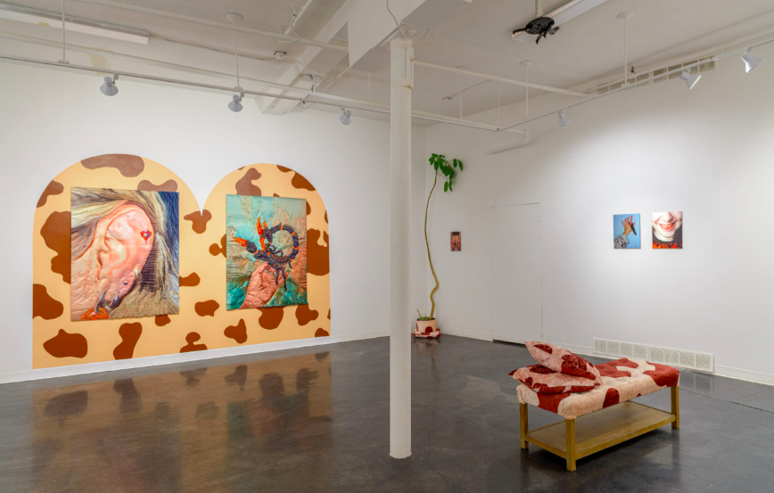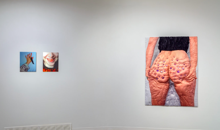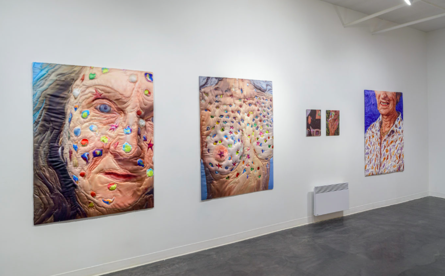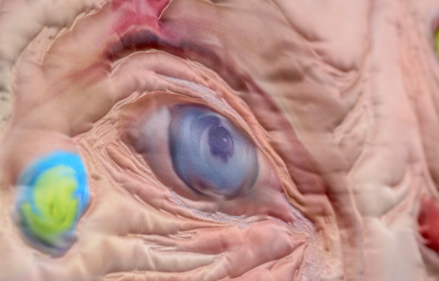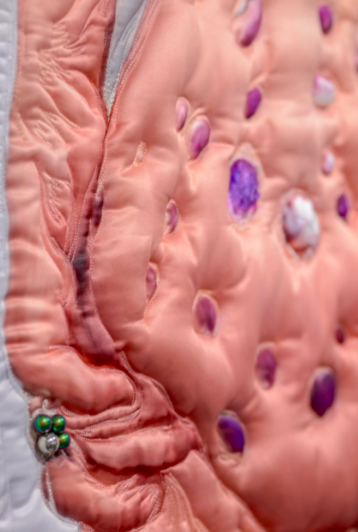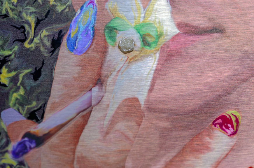 During the first 2 weeks of my residency, I devoted my time to gather and produce pictures that I turned into digital paintings. These images evoke a patchwork of feelings, memories, thoughts, references, and sensations. I turned these images into quilted, embroidered, and embellished textile pieces. Contrasting with the softness and warmness of the textile pieces, I also printed some of the paintings on aluminium and highlighted them with nail polish. The space of the exhibition is designed to accentuate the ambivalence between the feeling of intimacy and exposure.
