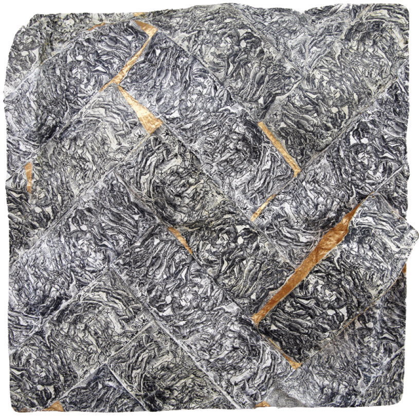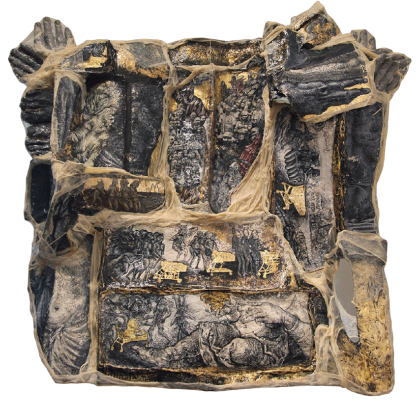 Gor constructs his pictorial spaces through an interplay of popular and kitschy elements to exhibit a critical and ironic interpretation of various historical figures as performers of ideological expression. Ongoing elements in his work are the shopping cart, the use of gold and mechanical reproduction, the irony against cultural authority, and the Byzantine iconic colour application from black and pure hues towards white—a painting method known as the “light spectrum” for true and revelatory seeing. All these inform the overall look of his narratives, which comment on our identity as individuals and contemporary society as a whole.