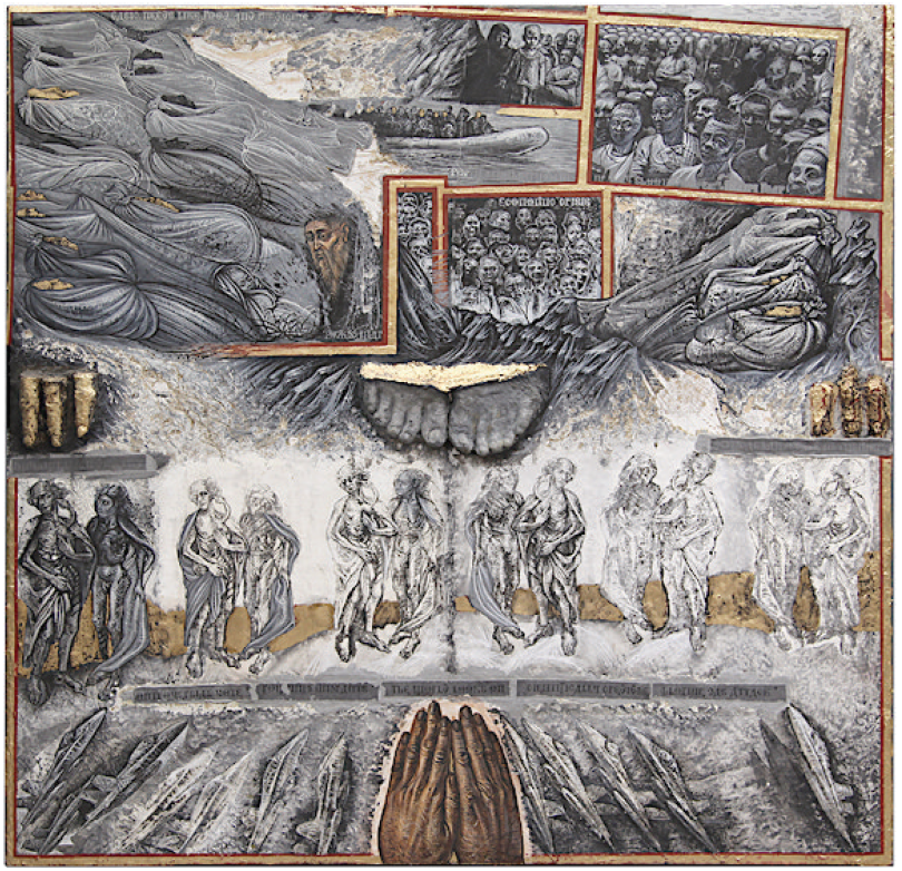 Instead of finding old saints, I discovered that our heroes are pop culture idols fighting against the same old evils of bigotry, greed and ignorance. Instead of scenes of heaven and redemption, I started painting apocalyptic images of a cast that included Drones and Shopping Cart.